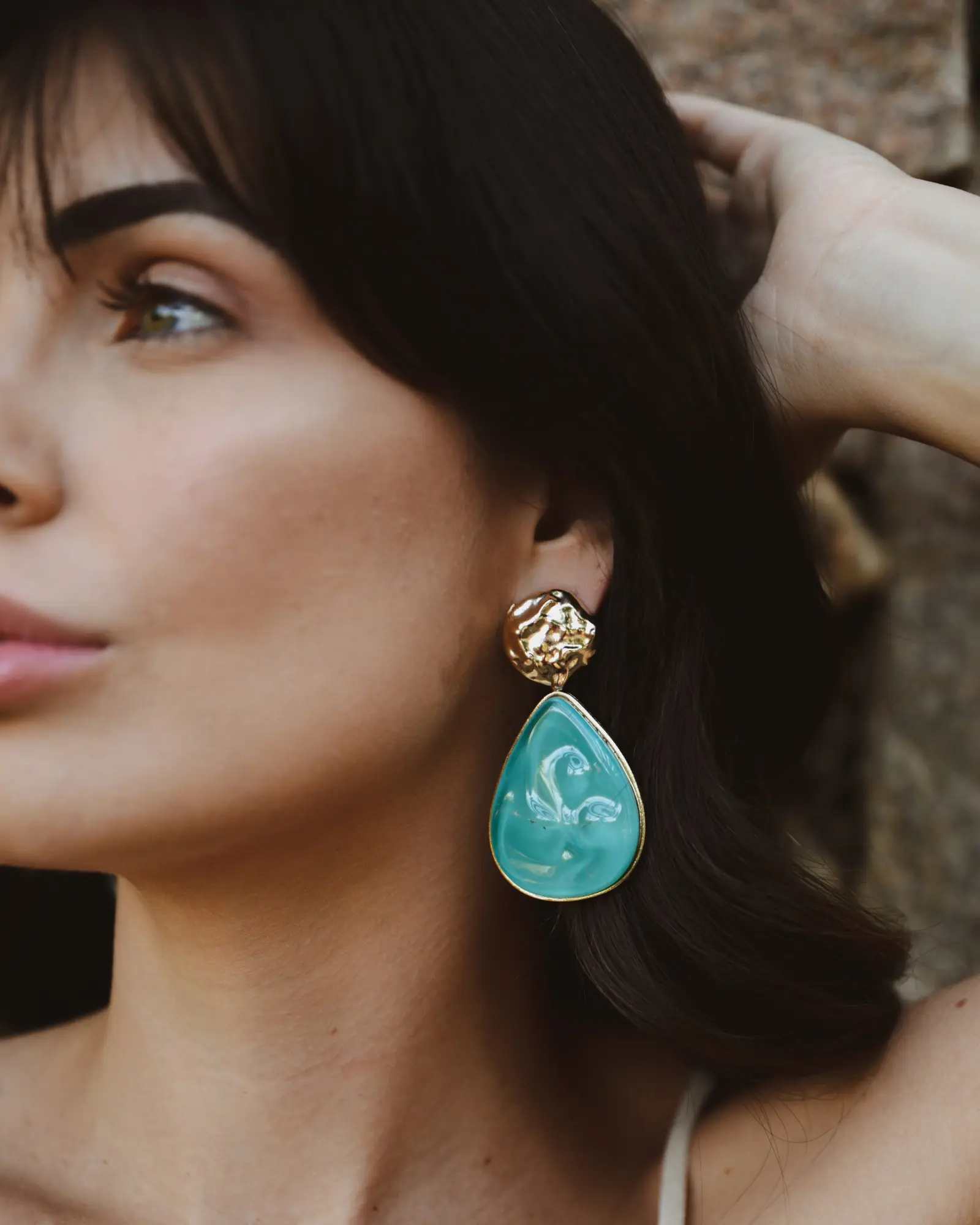 Brinco De Metal Martelado Com Gota De Pedra Resinada