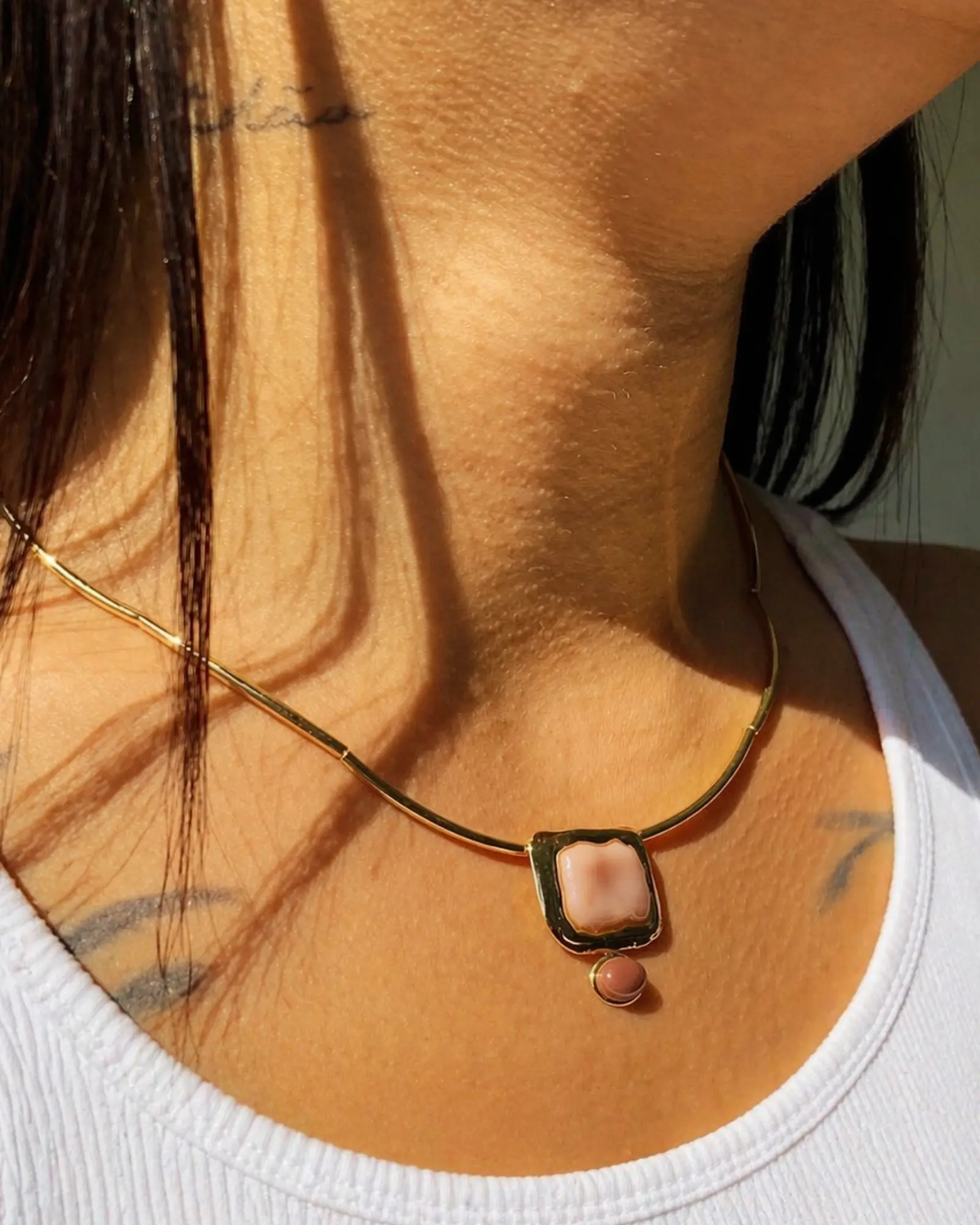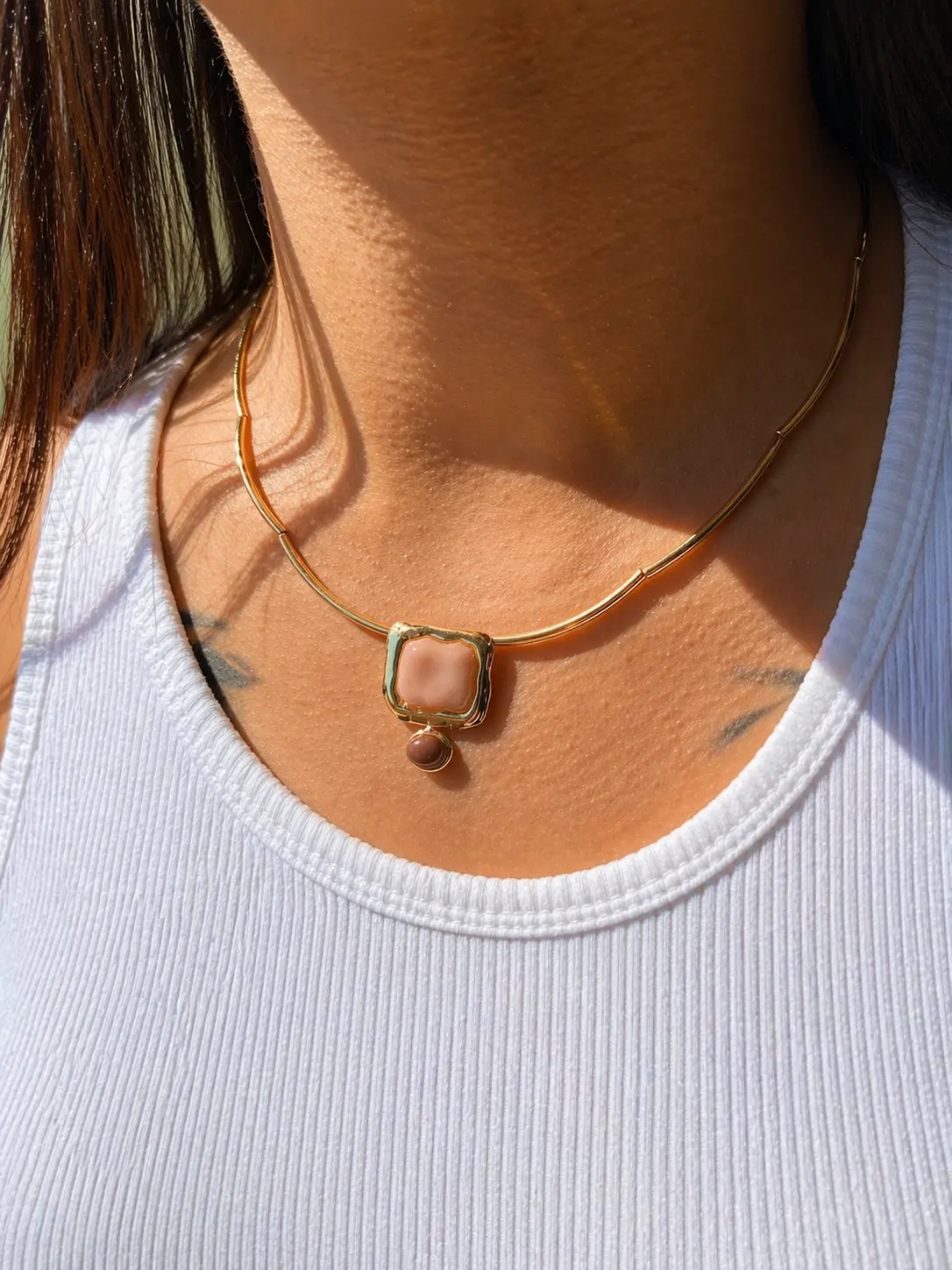 Choker de Canutilho com Detalhes de Metal Assimétrico e Pedras Resinadas Nas Cores Pele Rosada e Marrom