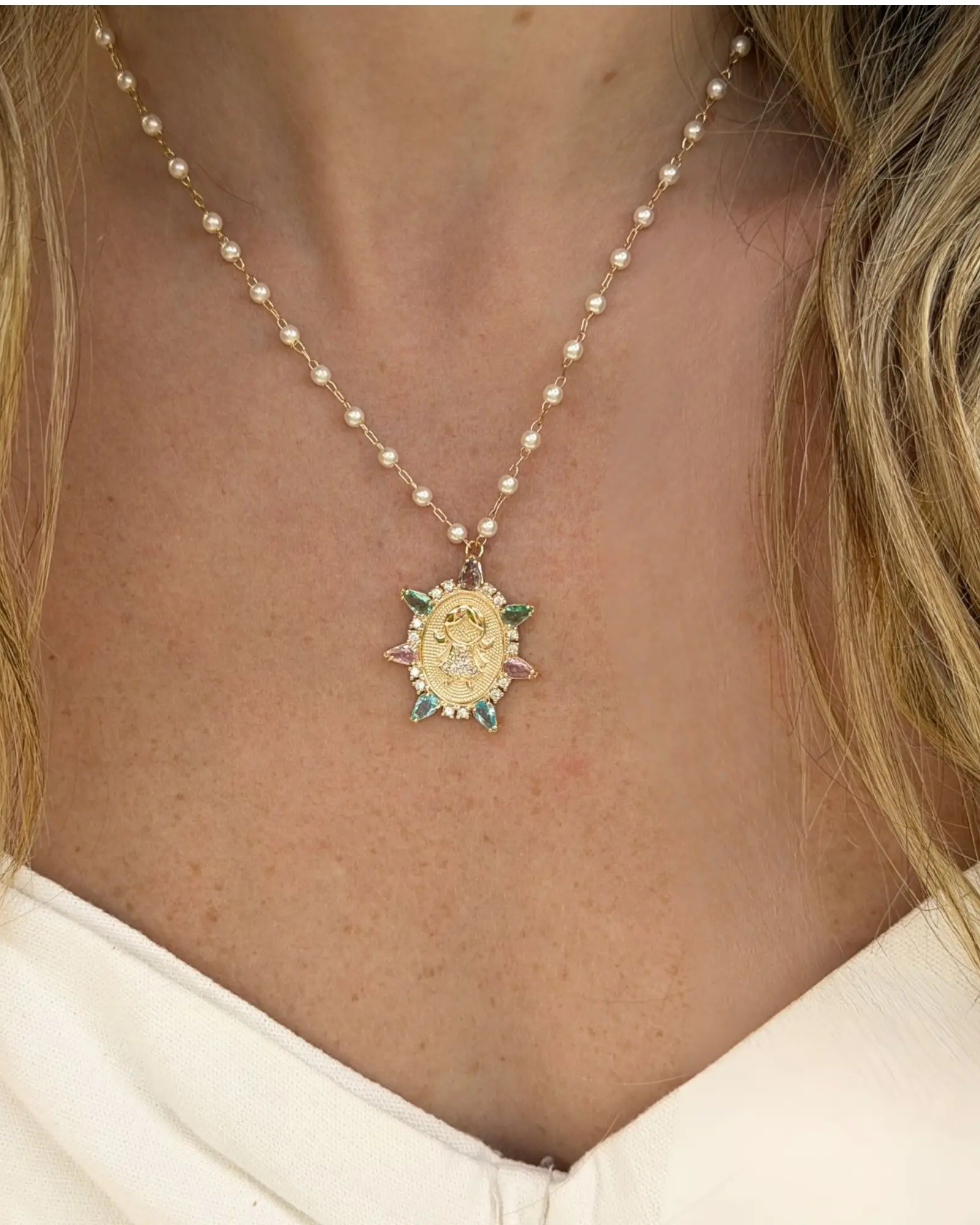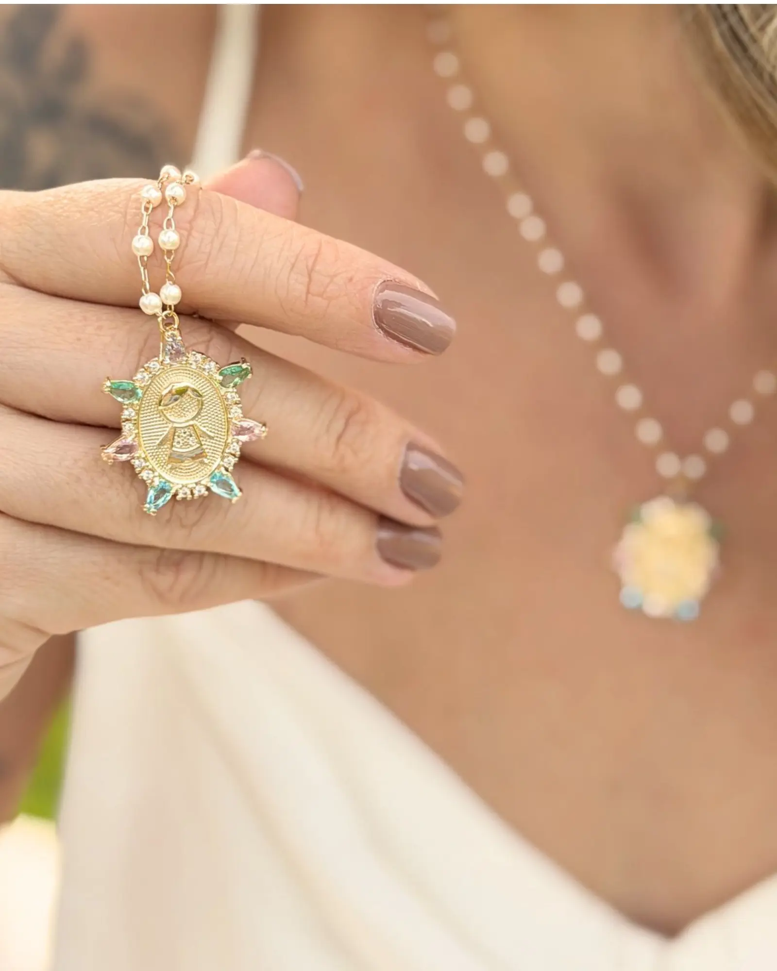 Colar Com Corrente De Pérola e Pingente De Filhos Com Pérolas e Zircônia em Volta