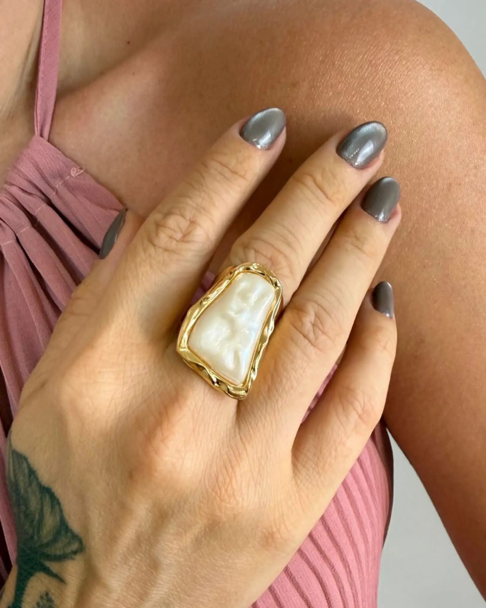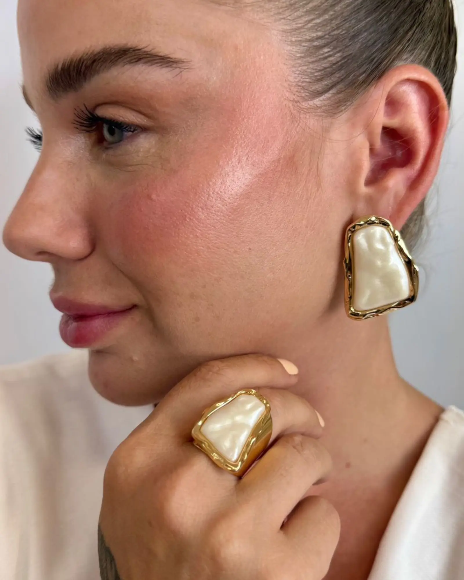 Conjunto de Pedra Resinada Texturizada Perolada Laluz une delicadeza e sofisticação em uma composição elegante com anel e brinco, perfeitos para valorizar o look com um toque moderno. A pedra resinada com efeito perolado e textura especial traz brilho suave e charme à peça, criando um visual feminino e atemporal.